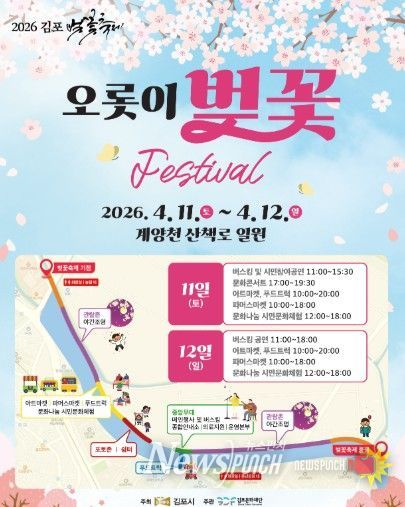 뉴스펀치 박상훈 기자 | 김포시가 오는 4월 11일부터 12일까지 양일간 계양천(김포본동~사우동 구간) 일원에서 ‘2026 김포 벚꽃축제’를 개최한다고 밝혔다.