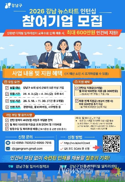 뉴스펀치 박상훈 기자 | 꿈이 모이는 도시, 미래를 그리는 강남구가 경력과 전문성을 갖춘 신중년의 재취업을 돕고 기업의 인력난을 덜기 위해 ‘2026년 강남 뉴스타트 인턴십’ 참여기업을 모집한다. 기업이 40~64세 신중년 강남구민을 신규 채용하면 인턴 기간과 계속 고용 여부에 따라 1인당 최대 600만 원의 인건비를 지원한다.