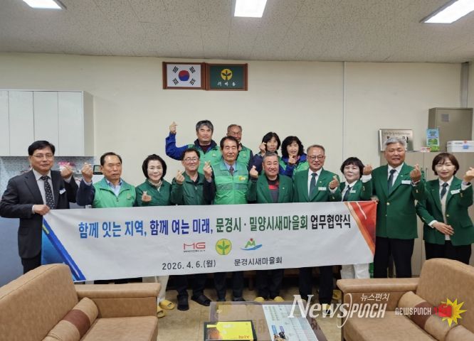 뉴스펀치 박세훈 기자 | 문경시새마을회(지회장 김현수)와 밀양시새마을회(지회장 이선동)는 4월 6일 오후 1시, 문경시새마을회 사무실에서 양 지역 간 상생 발전과 새마을운동 활성화를 위한 업무협약을 체결했다.