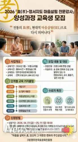뉴스펀치 박세훈 기자 | 재단법인 영주한국효문화진흥원은 효(孝) 문화의 전문적인 확산을 위해 4월 3일부터 5월 1일까지 ‘효(孝)-정서지도 마음살핌 전문강사’ 양성과정 교육생을 모집한다.