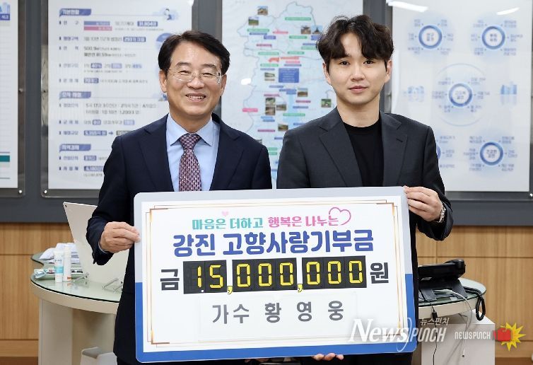 뉴스펀치 김용희 기자 | 강진군은 가수 황영웅이 강진군을 향한 각별한 애정을 담아 고향사랑기부금 1,500만 원을 기탁하며 지역사회 나눔 실천에 앞장섰다고 7일 밝혔다.