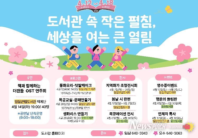 뉴스펀치 최영남 기자 | 임실군 군립도서관은 도서관의 날(4월 12일) 및 도서관주간(4월 12일~18일)을 맞아 ‘도서관 속 작은 펼침, 세상을 여는 큰 열림’이라는 슬로건으로 지역주민을 위한 다양한 독서․문화 프로그램을 운영한다고 밝혔다.