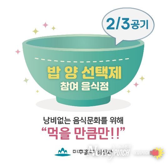 뉴스펀치 정홍균 기자 | 인천 미추홀구보건소(소장 차남희)는 건강한 식생활 문화를 확산하고 낭비 없는 음식 문화를 조성하기 위해, 4월부터 관내 음식점을 대상으로 ‘건강한 밥양 선택제’를 시행한다고 밝혔다.