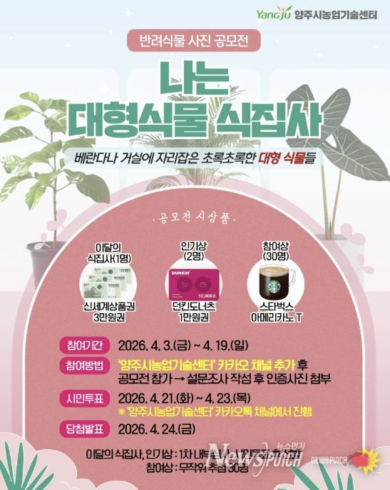 뉴스펀치 박상훈 기자 | 양주시농업기술센터가 시민과 함께하는 도시농업 문화 확산을 위해 ‘2026년 반려식물 사진 공모전’4월 참여자를 모집한다.