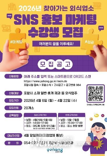 뉴스펀치 박세훈 기자 | 포항시는 지역 외식업소의 자생력과 온라인 홍보 역량 강화를 위해 ‘2026년 찾아가는 외식업소 SNS 마케팅 교육’ 참여 업소를 모집한다.