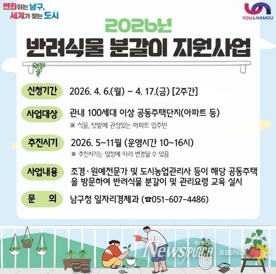 뉴스펀치 김윤걸 기자 | 부산 남구는 구민들의 반려식물 관리에 대한 이해를 돕고 관리 능력을 높이기 위해 ‘2026년 반려식물 분갈이 지원사업’에 참여할 공동주택을 모집한다고 밝혔다.