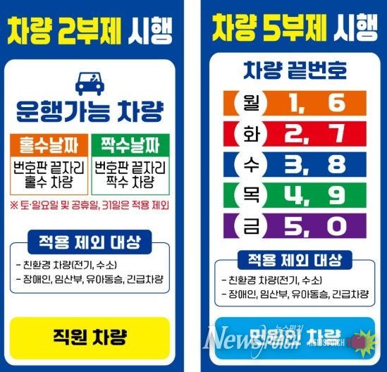 승용차 5부제는 도청을 방문하는 민원인 차량과 공영주차장에 적용된다. 차량번호 끝자리에 따라 해당 요일에는 출입이 제한되며, 요일별 적용 기준은 ▲월요일 1·6 ▲화요일 2·7 ▲수요일 3·8 ▲목요일 4·9 ▲금요일 5·0이다.