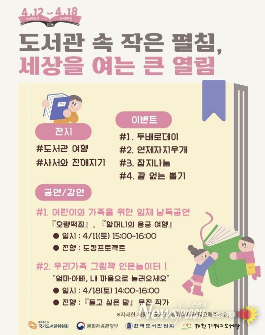 뉴스펀치 이현승 기자 | 제천기적의도서관은 제62회 도서관주간을 기념해 오는 4월 11일부터 19일까지 어린이와 가족이 함께 즐길 수 있는 다채로운 독서문화 프로그램과 이벤트를 운영한다.