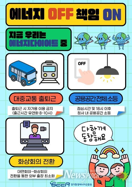캠페인은 ‘에너지 OFF, 책임 ON’이라는 구호 아래 ▲출퇴근 대중교통 이용 ▲공용공간 전체 소등 ▲회상회의 전환 등 생활 속 에너지 절약 활동을 중심으로 한다.