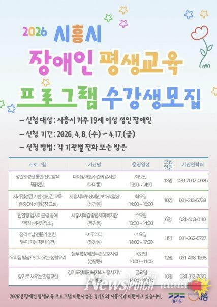 뉴스펀치 박상훈 기자 | 시흥시가 관내 성인 장애인의 학습권 보장과 사회참여 확대를 위해 ‘2026년 장애인 평생교육 프로그램 지원사업’을 본격적으로 시작하며, 4월 8일부터 17일까지 프로그램 운영을 위한 학습자를 모집한다.