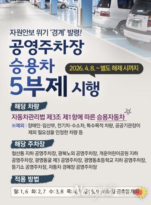 5부제 적용 대상은 ▲철산동 지하공영주차장, 광북 노외 공영주차장, 광명동초등학교 지하공영주차장, 광명동굴 제3공영주차장, 개운어린이공원 지하공영주차장 등 노외주차장 5곳과 ▲등기소 공영주차장, 자동차 경매장 공영주차장 등 노상주차장 2곳이다.