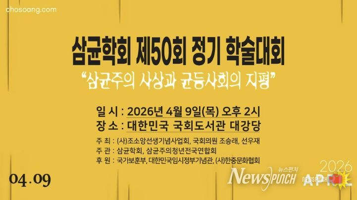 뉴스펀치 박상훈 기자 | 2026년 병오년(丙午年)을 맞아 '삼균학회 제50회 정기학술대회'가 국회도서관 대강당에서 개최된다. 이번 학술대회는 (사)조소앙선생기념사업회, 조승래 국회의원실, (사)선우재가 공동 주최하고, 삼균학회와 삼균주의청년연합회가 주관하며, 국가보훈부, 국립대한민국임시정부기념관, (사)한중문화협회가 후원한다.