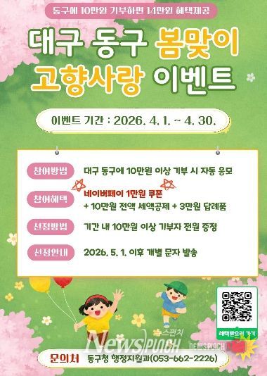 뉴스펀치 조평훈 기자 | 대구 동구청은 고향사랑기부제 활성화를 위해 4월 한 달간 ‘봄맞이 고향사랑 이벤트’를 진행한다.