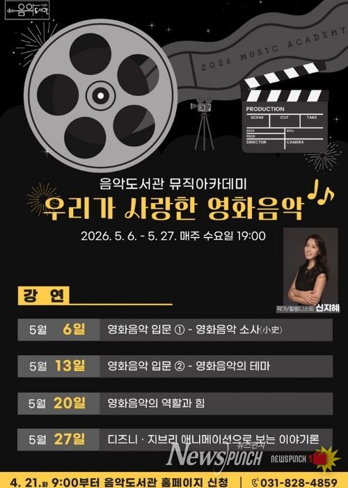 뉴스펀치 박상훈 기자 | 의정부음악도서관은 5월 6일부터 27일까지 매주 수요일 오후 7시, 상반기 뮤직아카데미 ‘우리가 사랑한 영화음악’을 운영한다.