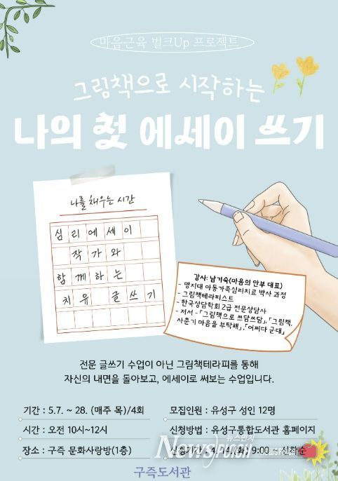 뉴스펀치 이현승 기자 | 대전 유성구는 5월 7일부터 28일까지 구즉도서관에서 성인을 대상으로 ‘마음근육 벌크UP 프로젝트–그림책으로 시작하는 나의 첫 에세이 쓰기’ 프로그램을 운영한다.