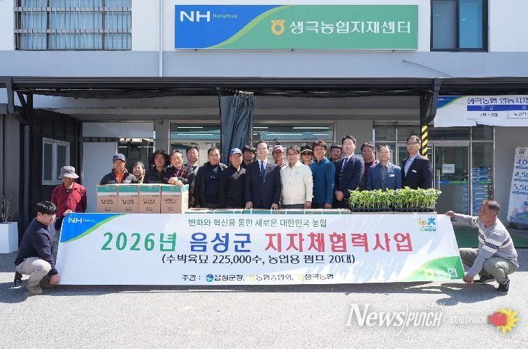 뉴스펀치 이현승 기자 | 음성군은 8일 생극농협 경제사업장에서 NH농협 음성군지부, 생극농협과 협력사업으로 마련한 농업용펌프 20대, 수박육묘 22만5000수를 농가에 전달했다.