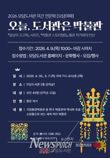 뉴스펀치 박상훈 기자 | 김포시 모담도서관에서는 4월 30일과 5월 7일 저녁 7시부터 9시까지 ‘오늘, 도서관은 박물관’ 강좌를 운영한다.