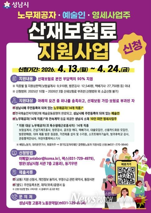 뉴스펀치 박상훈 기자 | 성남시는 오는 4월 13일부터 24일까지 노무제공자 및 예술인 등 노동취약계층을 대상으로 산재보험료 지원사업의 상반기 접수를 진행한다.