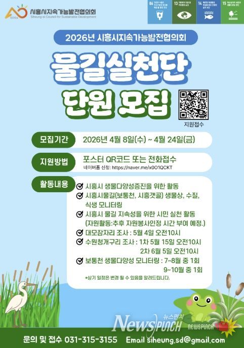 뉴스펀치 박상훈 기자 | 시흥시지속가능발전협의회는 시흥시 물길(보통천ㆍ시흥갯골)의 생태 현황을 파악하고 시민들의 환경 인식을 높이기 위해 ‘2026년 물길실천단’ 단원 10명을 오는 4월 24일까지 모집한다.