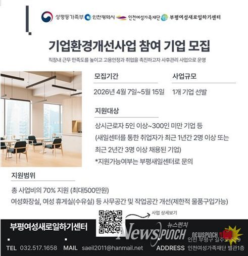 뉴스펀치 조평훈 기자 | 부평여성새로일하기센터는 여성친화적 근무환경 조성과 경력보유여성의 안정적인 고용 확대를 위해 '2026년 기업환경개선사업' 참여기업을 모집한다고 밝혔다.