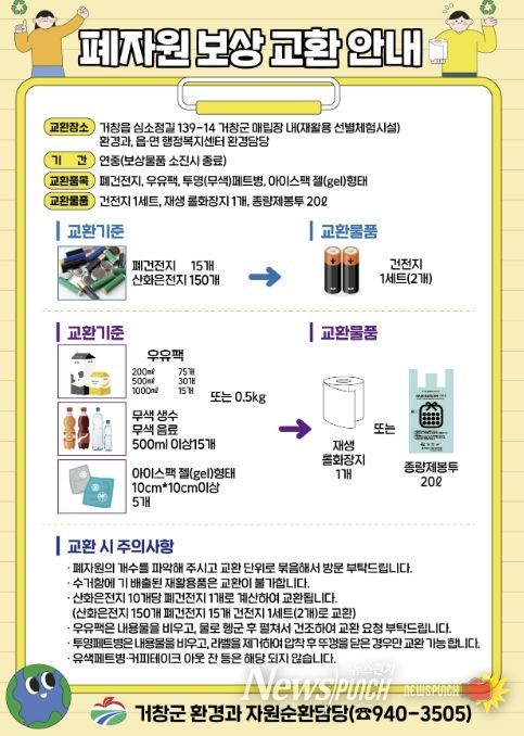 뉴스펀치 박세훈 기자 | 거창군은 자원순환 실천과 올바른 분리배출 문화 정착을 위해 폐자원보상 교환 사업을 확대 시행한다고 9일 밝혔다.