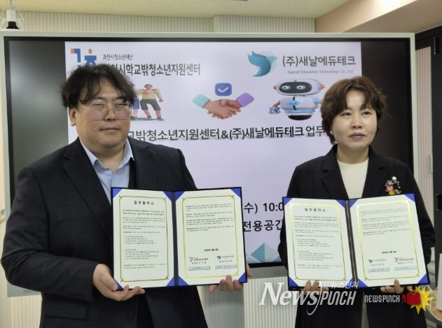 뉴스펀치 박상훈 기자 | 과천시청소년재단 학교밖청소년지원센터 ‘과천꿈드림’은 4월 8일 두 번째 샛뜨락에서 ㈜새날에듀테크와 학교밖청소년 대상 ‘인공지능(AI) 로봇교육 협력을 위한 업무협약’을 체결했다고 밝혔다.