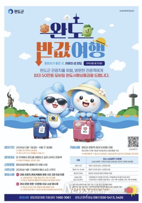 자세한 내용은 4월 13일부터 운영되는 ‘완도 반값 여행’ 누리집과 완도군청(고시공고) 누리집에서 확인 가능하다.