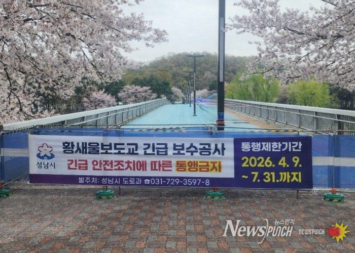 뉴스펀치 박상훈 기자 | 성남시는 수내동 소재 탄천을 횡단하는 ‘황새울보도교’에서 구조적 결함인 슬래브 균열이 발견됨에 따라, 시민 안전을 확보하기 위해 4월 9일부터 교량 통행을 전면 금지한다고 밝혔다.