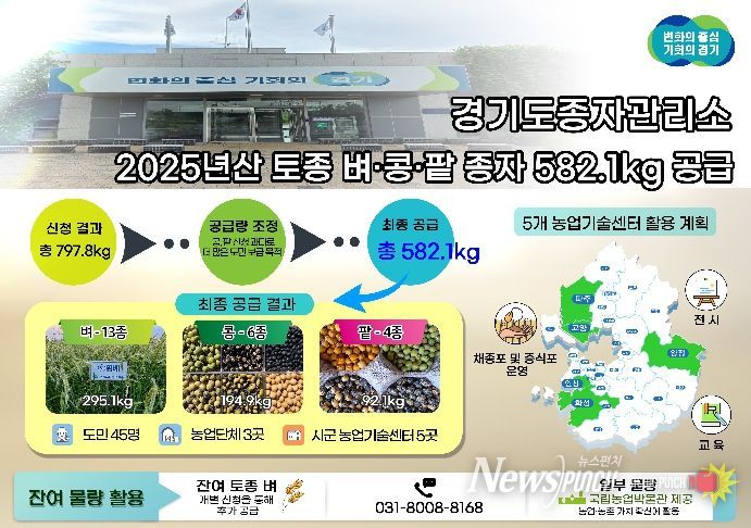 최종적으로 도민 45명, 농업단체 3곳, 시군 농업기술센터 5곳에 벼 295.1kg, 콩 194.9kg, 팥 92.1kg 등 총 582.1kg을 공급했다. 고양·안산·양평·파주·화성 농업기술센터는 해당 종자를 채종포와 증식포 운영, 전시 및 교육 등에 활용할 계획이다.