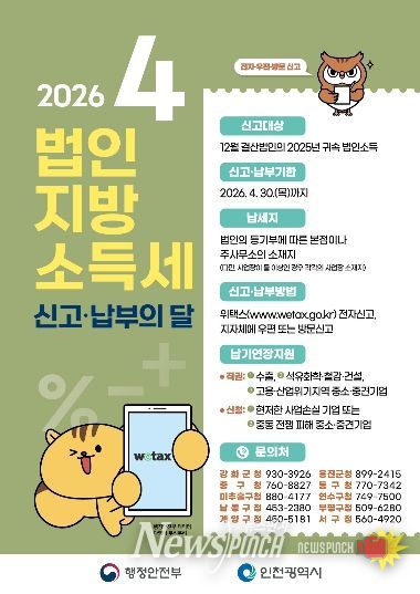 뉴스펀치 정홍균 기자 | 인천시 중구는 4월 한 달간 ‘법인지방소득세 신고·납부의 달’을 운영한다고 10일 밝혔다. 이에 따라 해당 법인은 오는 30일까지 법인지방소득세를 신고·납부해야 한다.