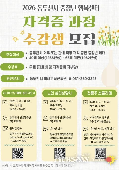 뉴스펀치 박상훈 기자 | 동두천시 미래교육진흥원은 지역 내 중장년층의 성공적인 인생 2막과 안정적인 사회 참여를 지원하기 위해 ‘2026년 중장년 행복센터 자격증 과정’ 수강생을 모집한다고 밝혔다.