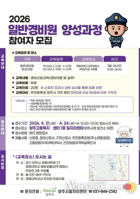 양주시가 오는 21일부터 24일까지 ‘2026년 취업지원프로그램 일반경비원 양성과정’ 교육생 20명을 모집한다.