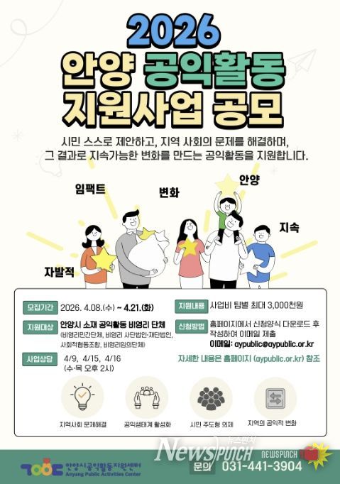 뉴스펀치 박상훈 기자 | 안양시공익활동지원센터는 지역의 문제를 창의적으로 해결하고 실질적인 사회적 변화를 만들어 갈 비영리단체 및 시민 모임을 모집한다고 10일 밝혔다. 이번 공모는 시민 주도의 공익 생태계를 구축하기 위해 ‘공익활동 지원사업’과 ‘커뮤니티기반 공익활동 협력사업’의 두 가지 트랙으로 운영된다.