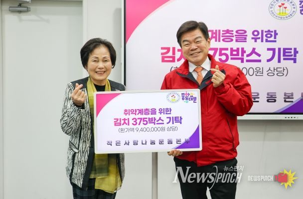 뉴스펀치 박상훈 기자 | 서울 동대문구는 9일 작은사랑나눔운동본부(대표 이남숙)로부터 저소득 가정을 위한 김치 2㎏ 375박스(940만 원 상당)를 전달받았다고 밝혔다.