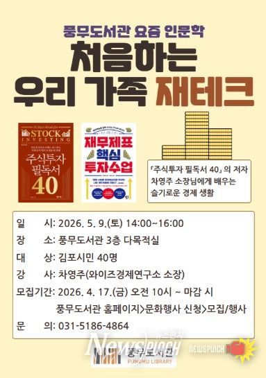 뉴스펀치 박상훈 기자 | 김포시 풍무도서관은 김포시민을 대상으로 ‘처음하는 우리 가족 재테크’를 오는 5월 9일 오후 2시부터 4시까지 운영한다.