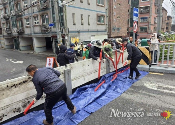 뉴스펀치 박상훈 기자 | 광명시가 10일 집중호우에 앞서 목감천 개명교 일원에서 목감천 범람에 대비한 차수판 설치 훈련을 실시했다.