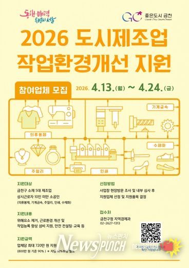 뉴스펀치 박상훈 기자 | 금천구는 '도시제조업 작업환경개선 지원사업' 참여 업체를 오는 4월 24일까지 모집한다고 밝혔다.