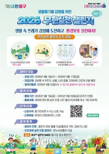 뉴스펀치 박상훈 기자 | 서울 중구는 생활폐기물 감량을 위한 ‘2026 무한실천 챌린지 시즌1’ 참여 주민 200명을 오는 17일까지 모집한다. 5월 한 달간 4가지 도전 과제를 통해 구민의 자발적인 실천을 유도하고, 올바른 분리배출 습관을 일상에 안착시킨다는 취지다.