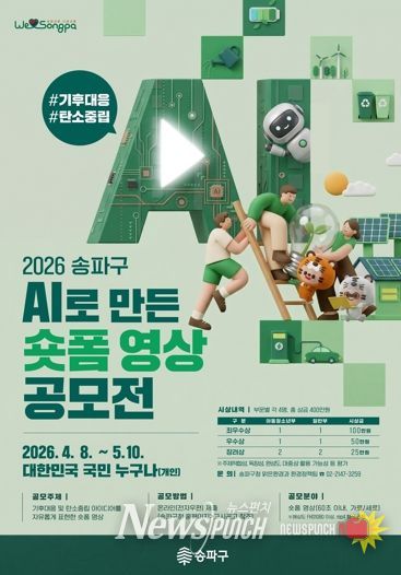 뉴스펀치 박상훈 기자 | 서울 송파구가 오는 6월 5일 ‘환경의 날’을 앞두고, 생성형 AI를 활용한 '송파구 AI로 만드는 기후대응 숏폼 영상 공모전'을 개최한다고 밝혔다.