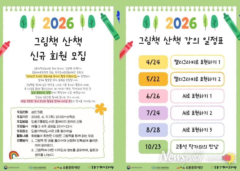 뉴스펀치 박상훈 기자 | 서울 도봉구 도봉기적의도서관이 독서동아리 ‘그림책 산책’을 확대 운영한다. ‘그림책 산책’은 그림책을 함께 읽고 이야기를 나누는 성인 독서 동아리다. 앞서 도서관은 문화체육관광부와 한국도서관문화재단이 추진하는 녪년 도서관 문화예술 동아리 활동 지원사업’에 선정됐다.