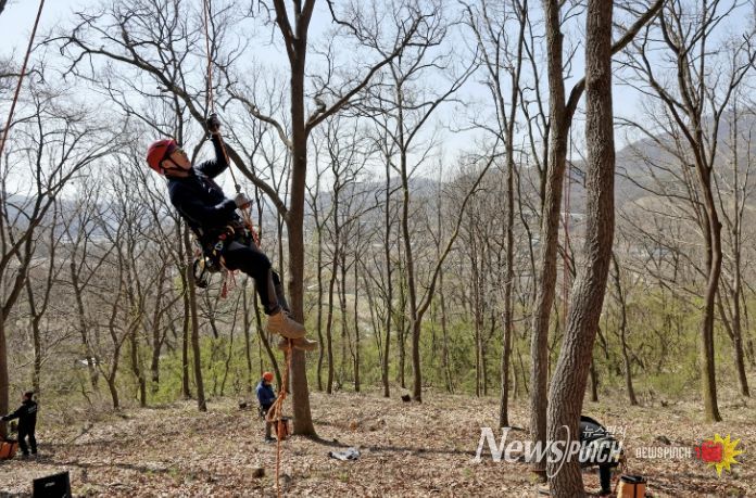 1급 과정을 교육 중인 야외 교육장에서는 10kg이 넘는 묵직한 장비 벨트를 허리에 찬 남성이 능숙하게 로프를 던져 11m 높이의 나무 기둥에 걸었다. 아찔한 높이지만 거침이 없다. 밧줄 하나에 의지해 허공을 오르길 잠시 나무 상단부에 도달한 그가 예리한 톱으로 병든 가지를 골라내자 지켜보던 교육생들 사이에서 응원의 함성이 나왔다.