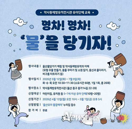 뉴스펀치 김윤걸 기자 | 울산 약사동제방유적전시관이 관내 어린이집과 유치원 원아를 대상으로 울산의 고유 수리민속을 체험하는 '영차! 영차! 물을 당기자!' 교육 프로그램을 운영한다.