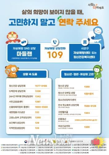 또한 3월부터 5월까지 자살 고위험 시기를 맞아 전 시군과 함께 생명존중 캠페인, 홍보활동을 집중 추진하고, 필요시 누구나 상담받도록 자살예방 상담전화 109와 정신건강 상담전화 1577-0199 안내를 강화한다.