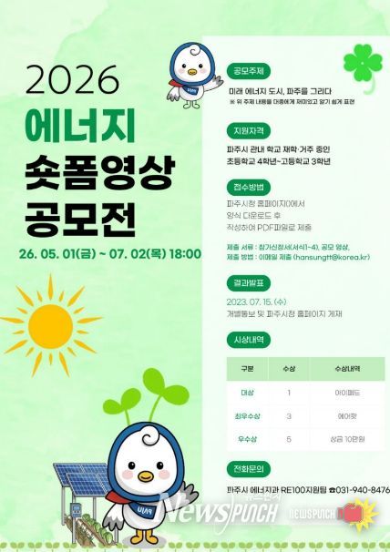 뉴스펀치 박상훈 기자 | 파주시는 청소년들의 에너지 인식을 제고하고 디지털 미디어 활용 역량을 강화하기 위해 녪년 파주시 청소년 에너지 숏폼 영상 공모전’을 개최한다.