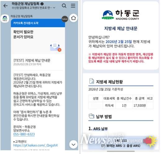 하동군 관계자는 “카카오 알림톡을 활용한 체납 안내는 징수율 향상 뿐만 아니라 종이 고지서 감소에 따른 예산 절감과 탄소중립 실천에도 기여하고 있다”며 “앞으로도 디지털 기반 납세 행정과 체납관리 체계를 지속적으로 강화해 나가겠다”고 밝혔다.