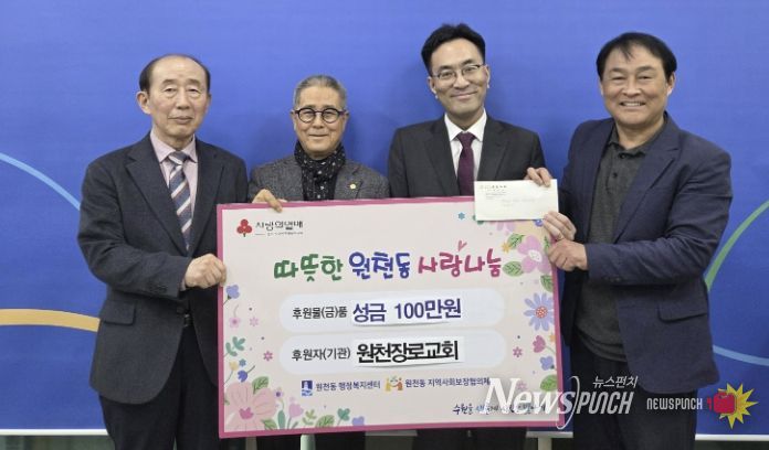 뉴스펀치 박상훈 기자 | 수원시 영통구 원천동은 지난 10일 원천장로교회가 지역 내 저소득 주민들을 돕기 위해 성금 100만 원을 행정복지센터에 기탁했다고 밝혔다.