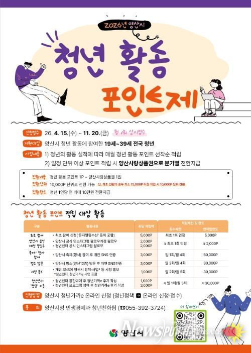 뉴스펀치 박세훈 기자 | 양산시는 청년들의 능동적인 사회활동 참여를 이끌어내고 지역사회에 대한 관심을 높이기 위해 ‘2026년 양산시 청년 활동 포인트제’를 신규 시행한다고 밝혔다.