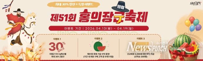 뉴스펀치 박세훈 기자 | 의령군은 제51회 홍의장군축제를 맞아 오는 13일부터 19일까지 7일간 공식 온라인 쇼핑몰 ‘토요애’에서 특별이벤트를 진행한다.