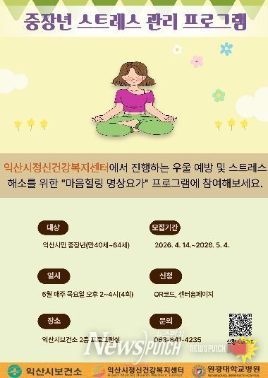 익산시정신건강복지센터는 만 40~64세 중장년을 대상으로 '마음힐링 명상요가' 프로그램을 운영한다고 13일 밝혔다.