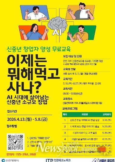 뉴스펀치 정홍균 기자 | 인천광역시가 추진하고 인천테크노파크(인천TP)가 운영하는 ‘신중년아지트’는 오늘부터 인천 신중년(40~64세)을 대상으로 ‘AI 기반 소규모 창업 교육’ 참여자를 모집한다고 밝혔다.